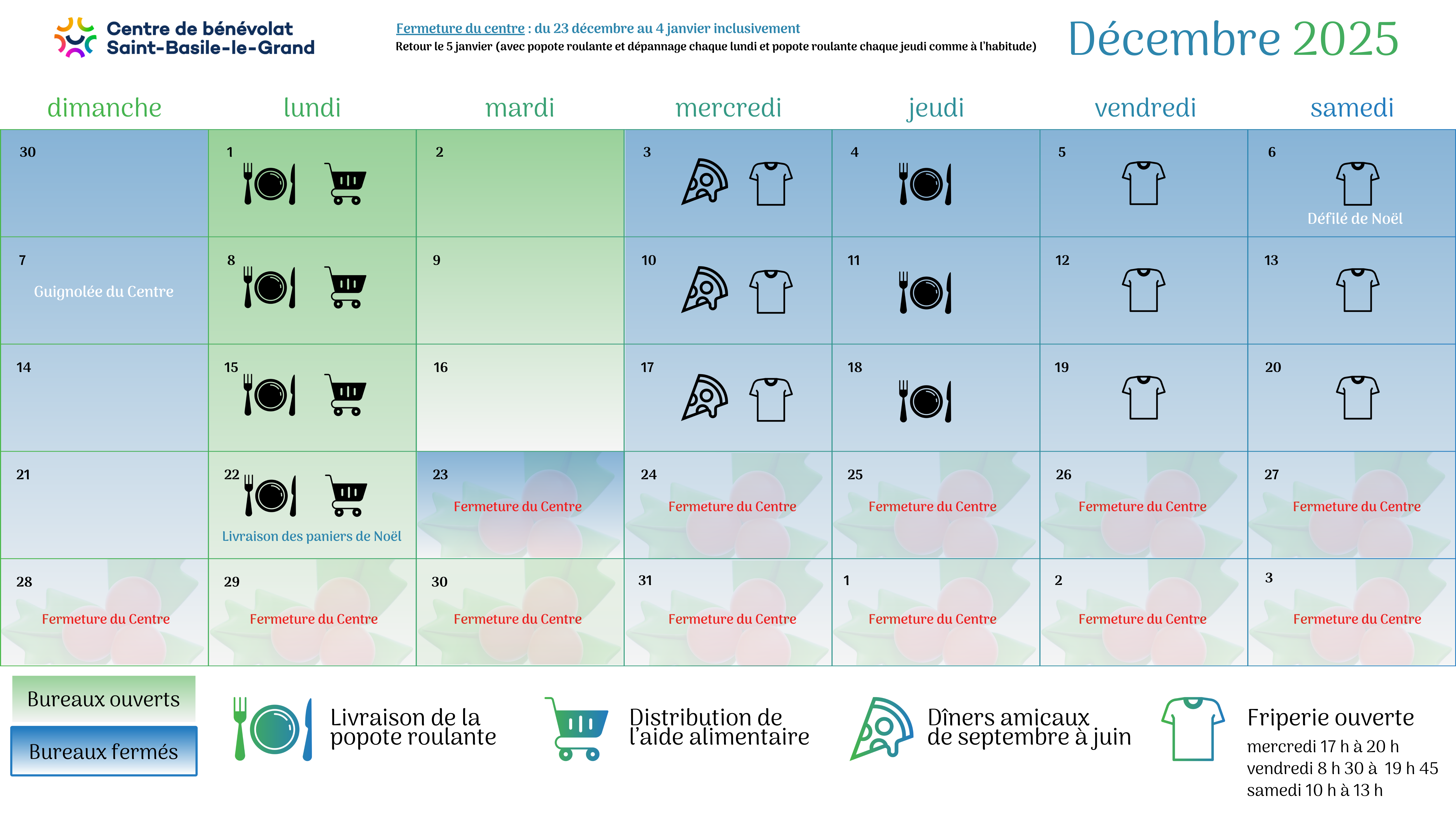 Bienvenue au Centre de Bénévolat St-Basile-le-Grand !Fondé en 1981 par Mme Lise B. Boisvert, le Centre de Bénévolat St-Basile-le-Grand est un organisme à but non lucratif dont la mission est de promouvoir et développer l’action bénévole, offrir des services multiples aux personnes vulnérabilisées et améliorer la qualité de vie des citoyens de sa communauté. Infirmière de formation, la fondatrice du centre a été une grande précurseur d’accompagnement en soins palliatifs et de soutien en période de fin de vie. Ses formations et écrits font encore aujourd’hui office de référence dans ce domaine. Une femme exceptionnelle dont la générosité et l’empathie auront laissé une marque indélébile dans la communauté Grand Basiloise. « La paix passera par la fraternité, ou elle ne passera pas » disait-elle. Œuvrant dans la communauté depuis presque 45 ans, le Centre offre différents services développés en partenariat avec les ressources du milieu, afin de répondre aux besoins émergents des citoyens vulnérabilisés financièrement, physiquement etou socialement. Les bénéficiaires se compose notamment de personnes âgées et de tous âge, d’étudiants, de familles monoparentales, de jeunes familles et de nouveaux arrivants. |