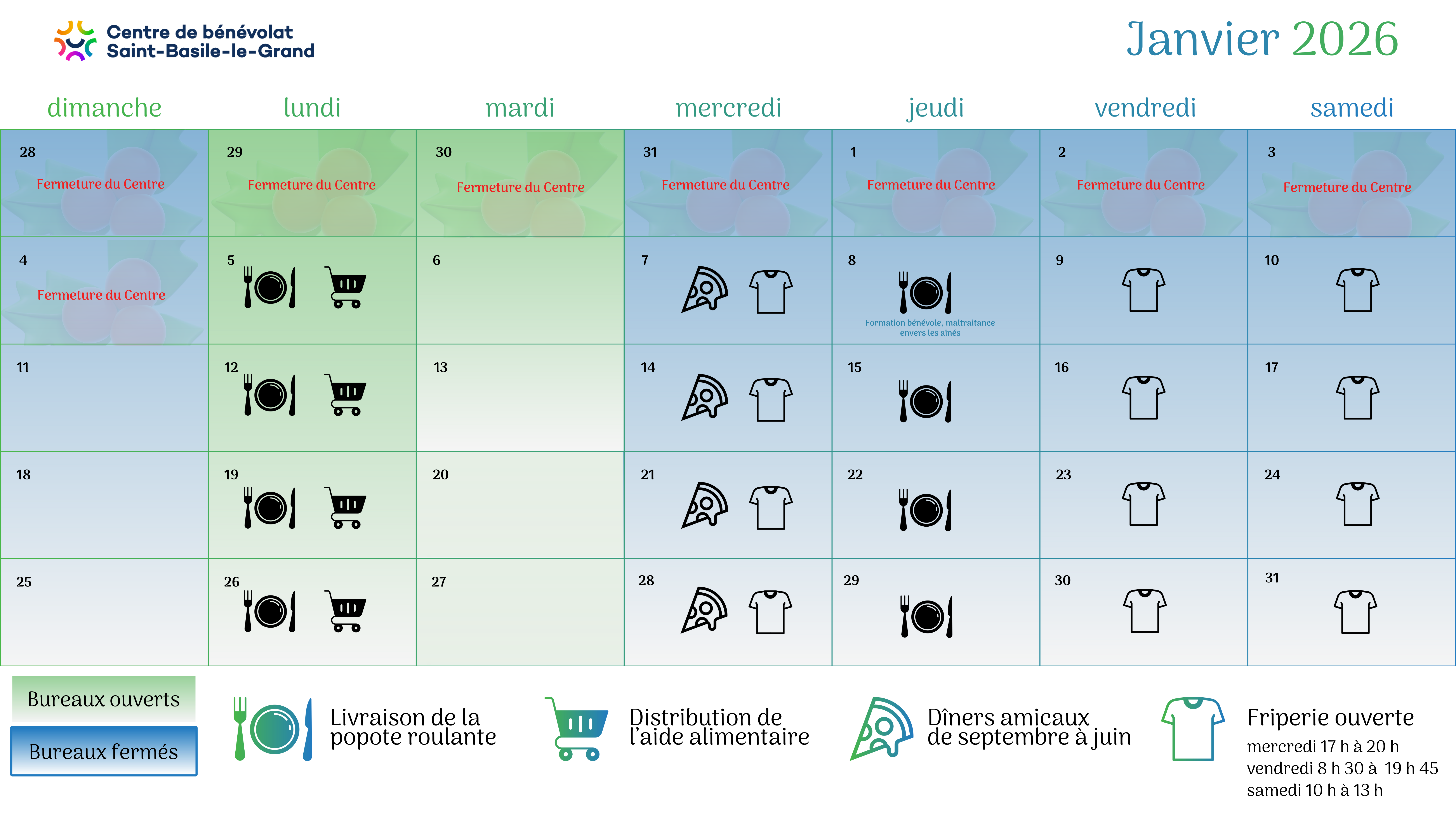 Bienvenue au Centre de Bénévolat St-Basile-le-Grand !Fondé en 1981 par Mme Lise B. Boisvert, le Centre de Bénévolat St-Basile-le-Grand est un organisme à but non lucratif dont la mission est de promouvoir et développer l’action bénévole, offrir des services multiples aux personnes vulnérabilisées et améliorer la qualité de vie des citoyens de sa communauté. Infirmière de formation, la fondatrice du centre a été une grande précurseur d’accompagnement en soins palliatifs et de soutien en période de fin de vie. Ses formations et écrits font encore aujourd’hui office de référence dans ce domaine. Une femme exceptionnelle dont la générosité et l’empathie auront laissé une marque indélébile dans la communauté Grand Basiloise. « La paix passera par la fraternité, ou elle ne passera pas » disait-elle. Œuvrant dans la communauté depuis presque 45 ans, le Centre offre différents services développés en partenariat avec les ressources du milieu, afin de répondre aux besoins émergents des citoyens vulnérabilisés financièrement, physiquement etou socialement. Les bénéficiaires se compose notamment de personnes âgées et de tous âge, d’étudiants, de familles monoparentales, de jeunes familles et de nouveaux arrivants. |